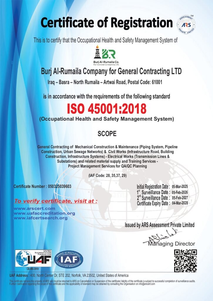 • ISO 45001:2018 – Occupational Health & Safety Management System: Reinforces our dedication to providing a safe and healthy work environment for employees and stakeholders.
